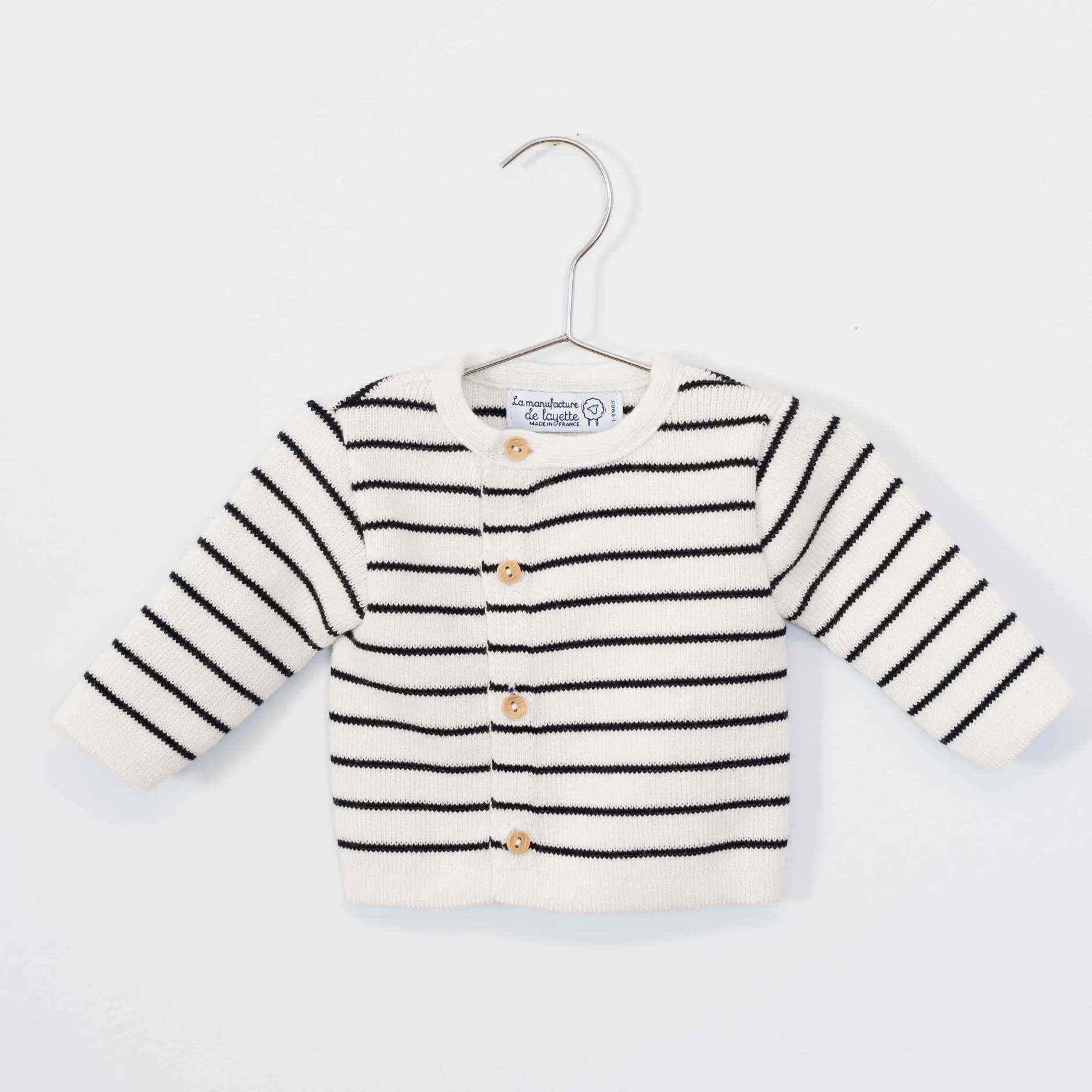 Ce charmant petit cardigan, de la collection des Petits Marins, est intégralement tricoté en acrylaine : 50% laine pour garder bébé au chaud, et 50% acrylique pour la douceur.