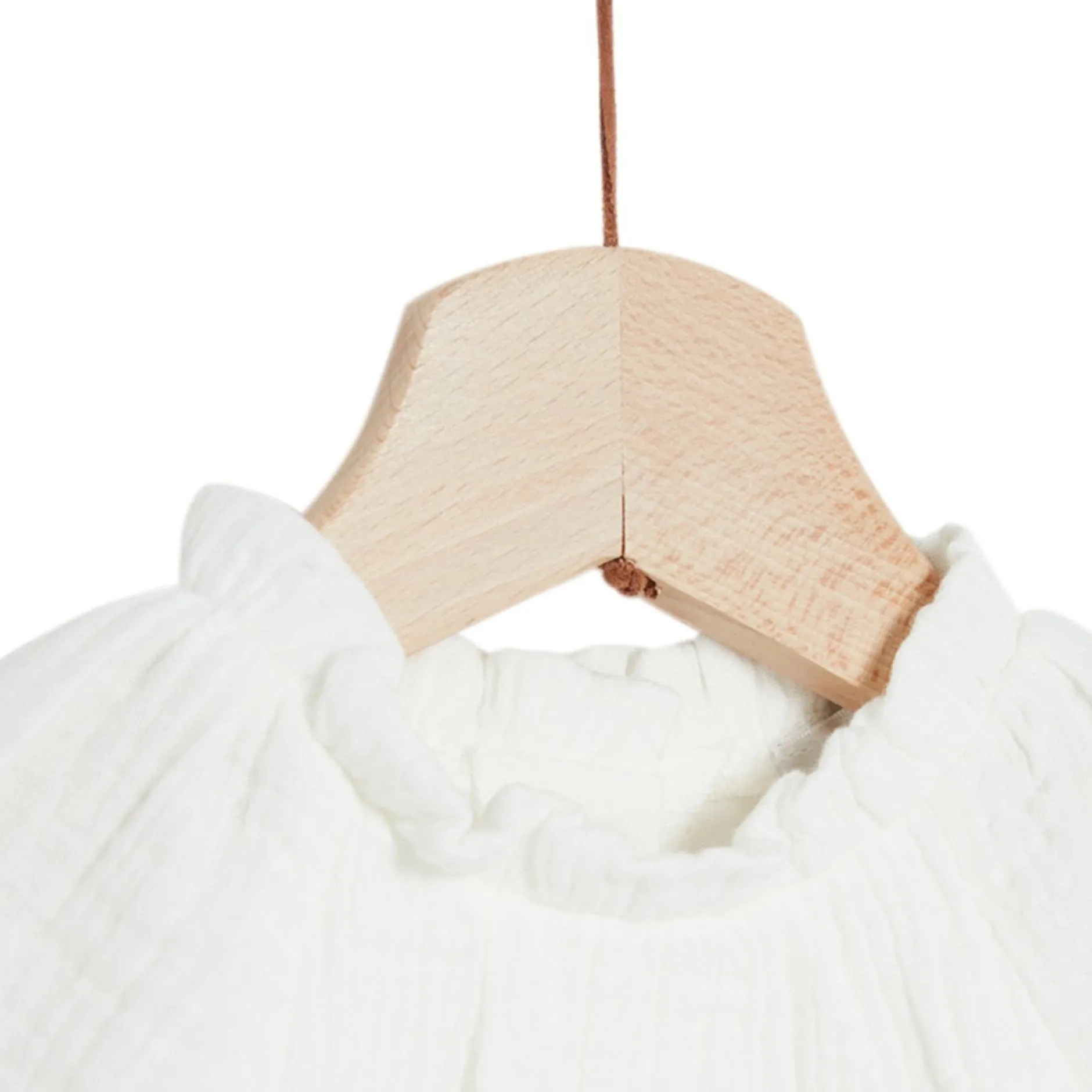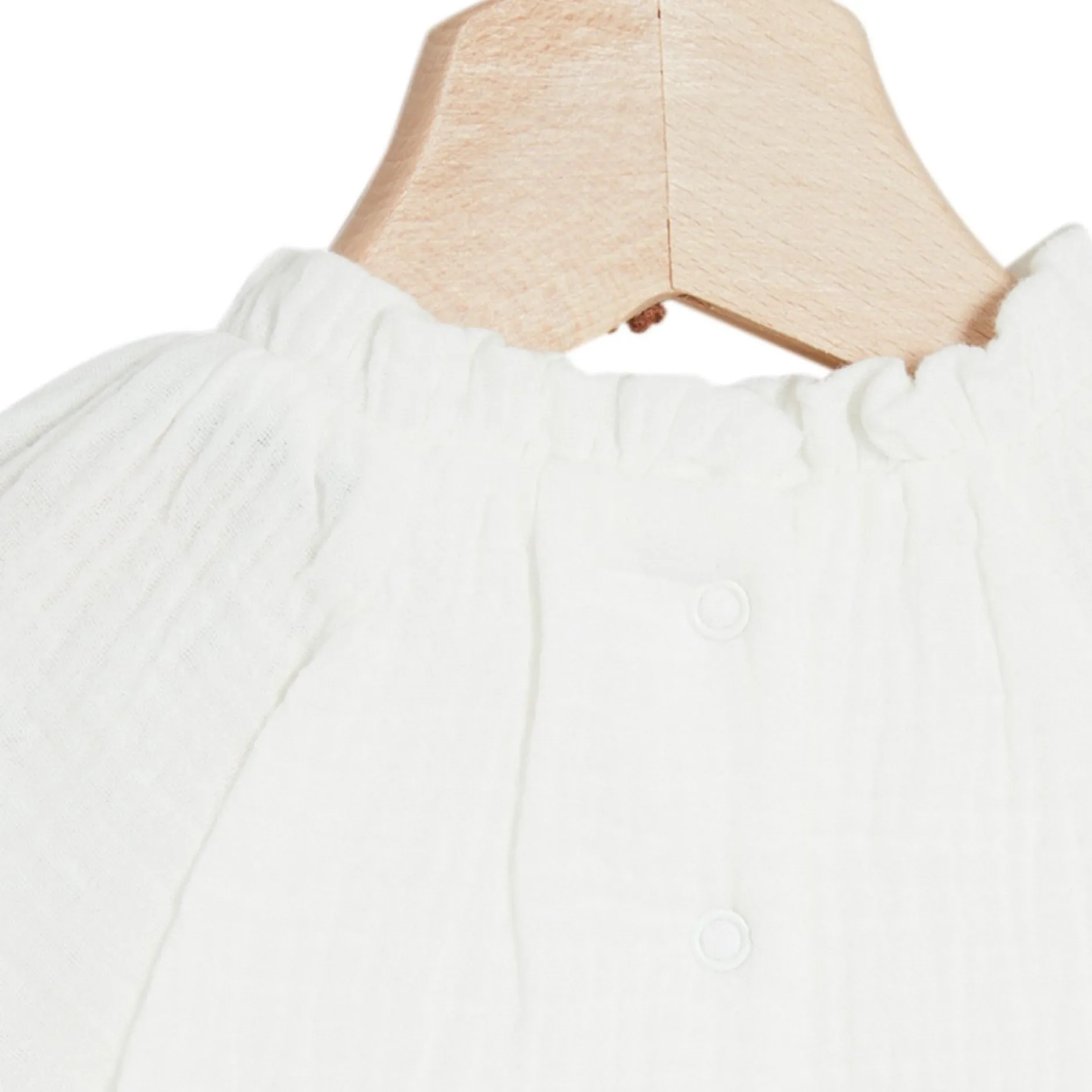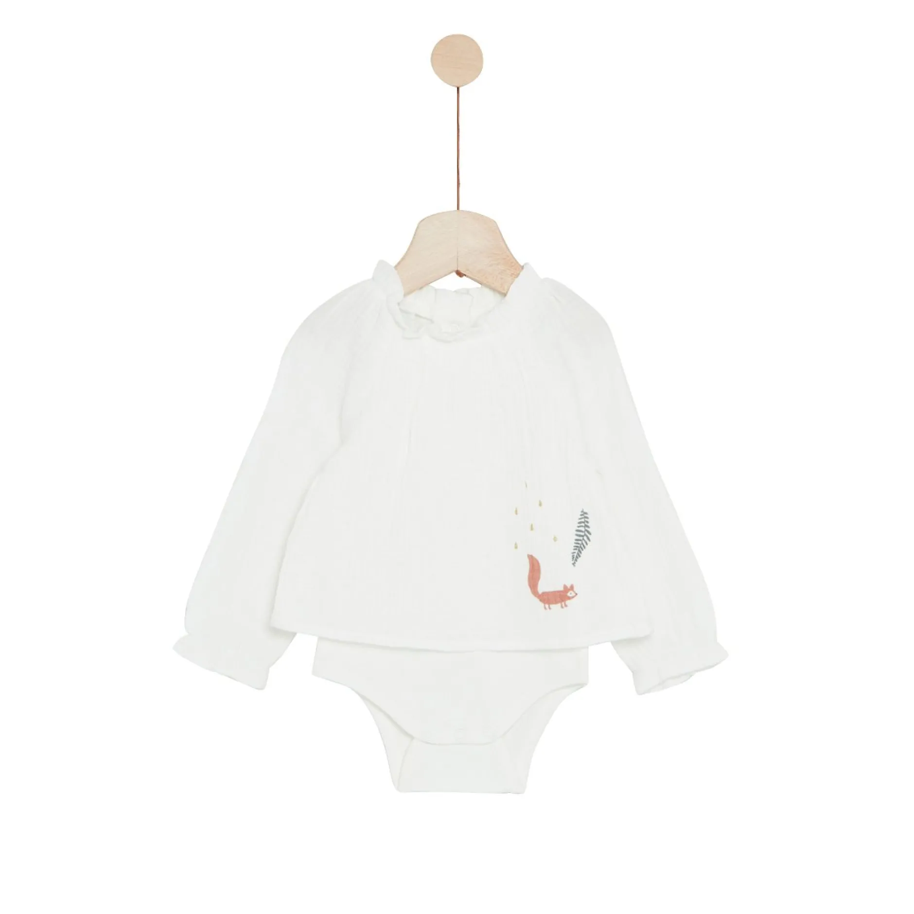 Petit body tunique Marèse en coton bio composé d’une tunique attenante en mousseline de gaze écrue et le body est en côte écru . Adorable avec son look rétro avec ses détails raffinés comme le bas de manches et l’encolure froncés par un petit élastique ! Cette pièce se portera seule ou sur un legging. Très ludique avec son animation devant représentant nos mascottes du thème : petit ours et petit écureuil s’amusant dans une forêt !