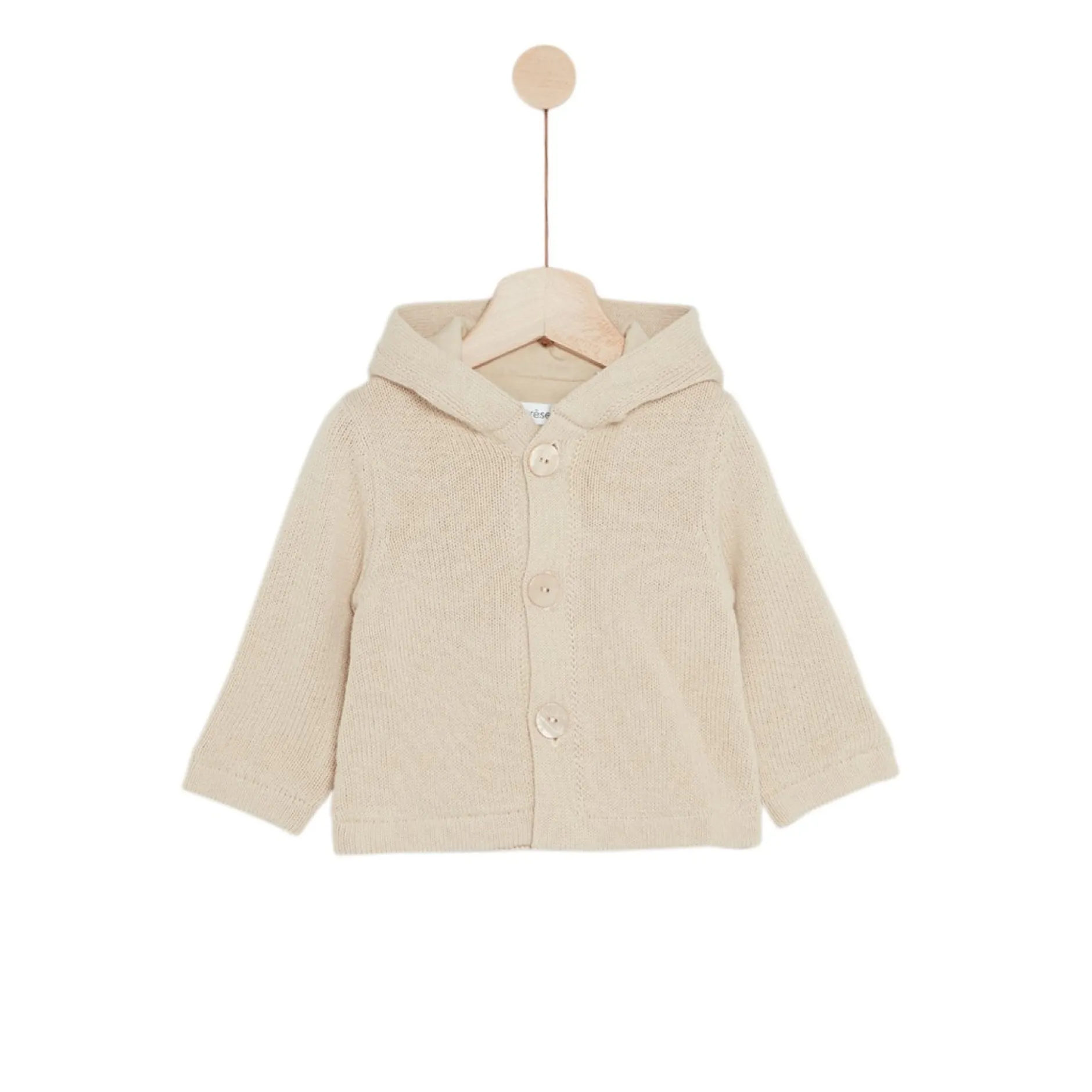 Petite veste en tricot de coton bio. Très raffinée avec son jeu de point mousse et ses oreilles en volume qui rappellent les oreilles du petit ourson. Existe en beige nougat et brun terracotta. Très beau jacquard dans le dos représentant une tête d’ours. Ouverture devant par des boutons gravés. La parfaite pièce qui s’associe avec les pièces du thème pour embellir les silhouettes et qui tiendra bébé bien au chaud l’hiver.