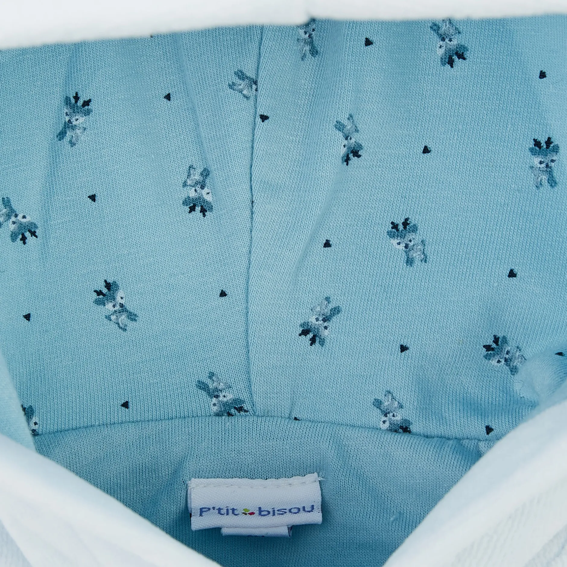 Veste à capuche P’tit Bisou en velours très doux bleu pâle doublé de jersey imprimé petits daims.
