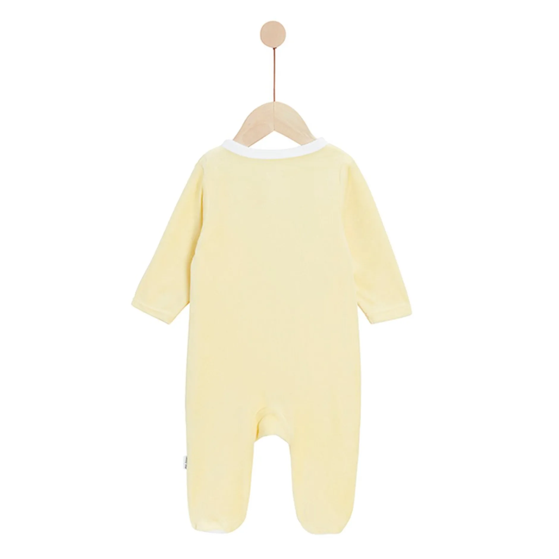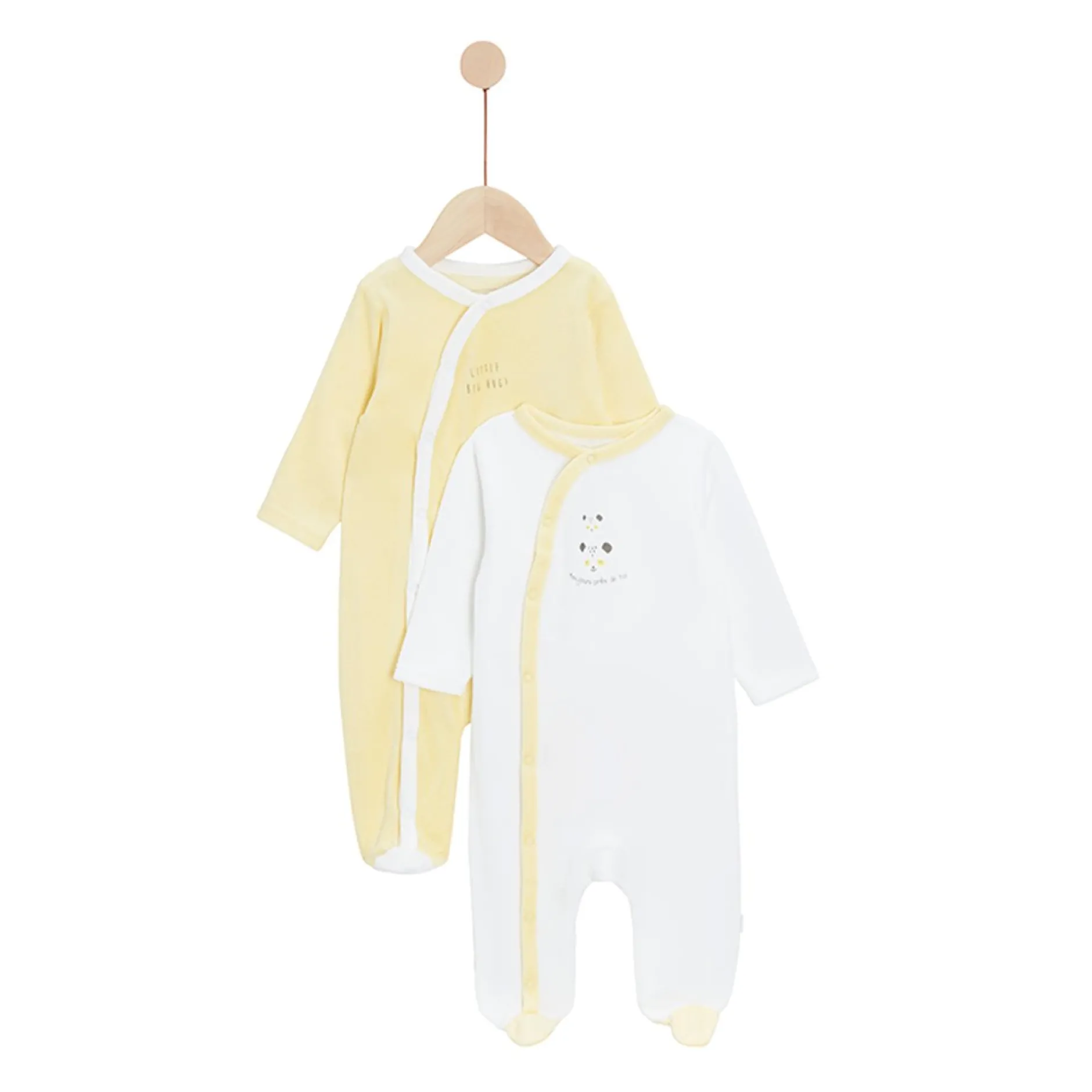Lot de pyjamas P’tit Bisou, mixte, en velours tout doux : 1 jaune et 1 blanc. Tous deux sont ouverts devant par des pressions pour la plus grande fonctionnalité et évite ainsi de trop manipuler bébé.