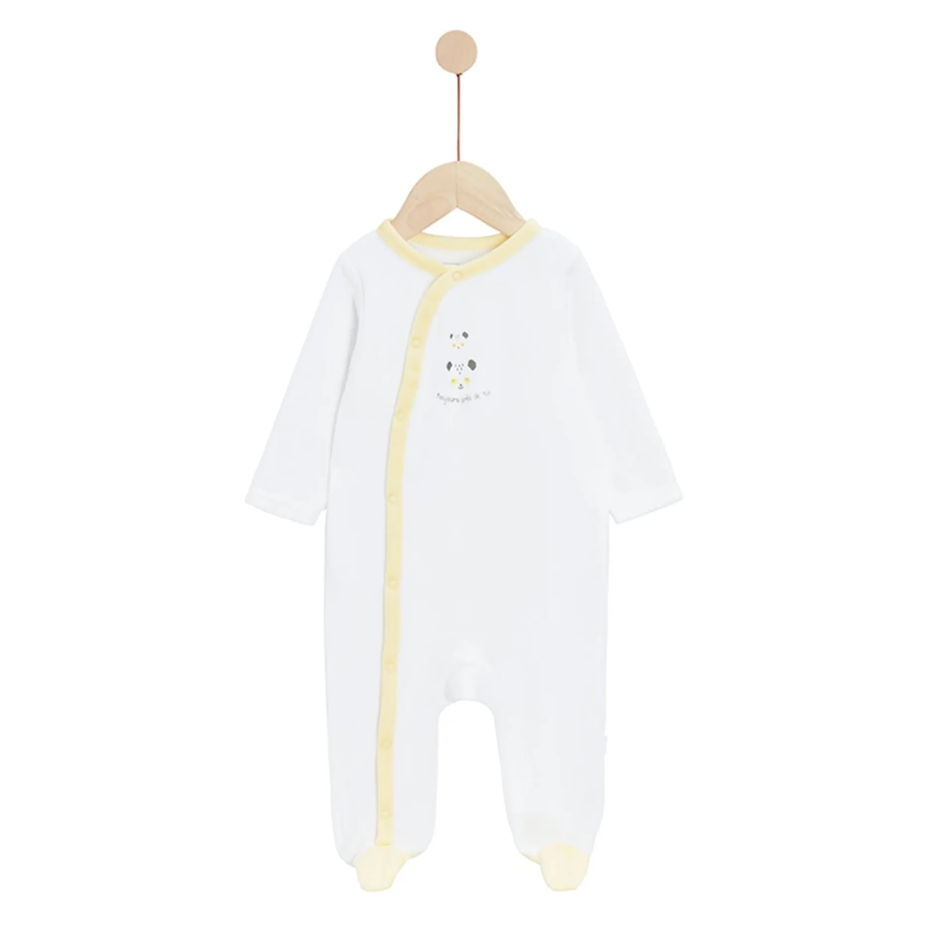 Le pyjama blanc a 2 têtes de panda sur le devant très affectives et mignonnes et un texte « toujours près de toi » et a les pieds et le coletage devant en opposition de couleur en jaune.