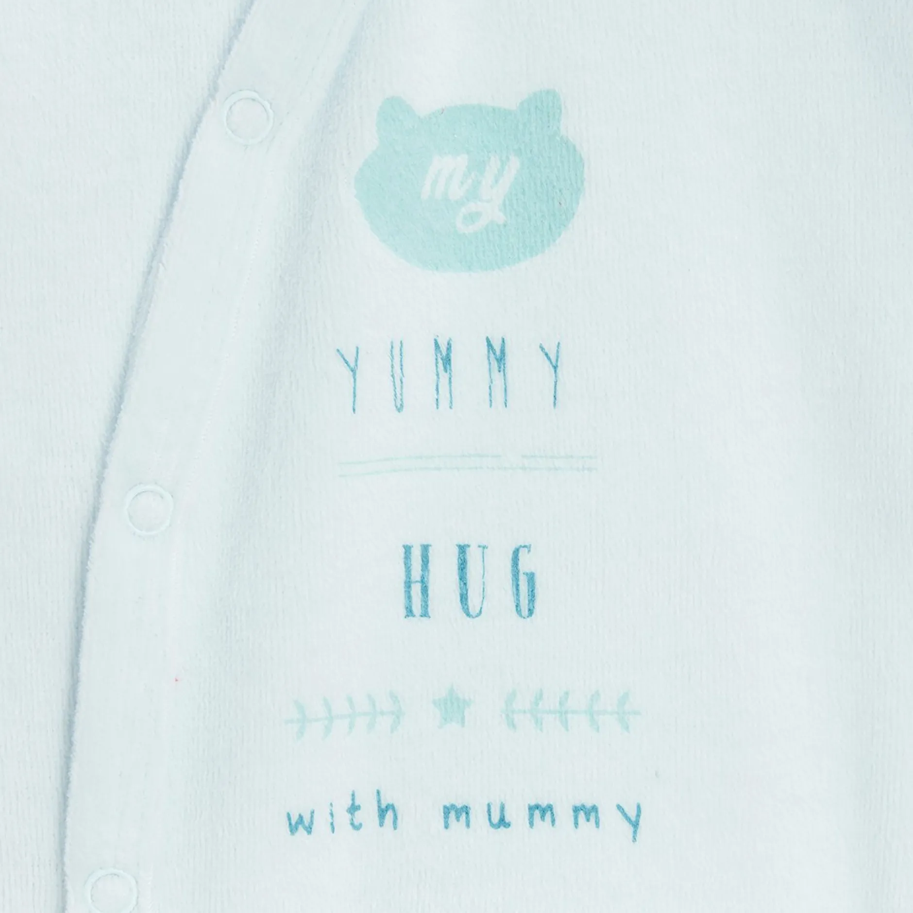 Ouverture devant par des pressions pour la plus grande fonctionnalité car évite ainsi de trop manipuler bébé. Jolie animation devant avec le texte affectif et ludique » Little big hug » qui veut dire « Petit gros câlin » et la tête d’un petit chat.