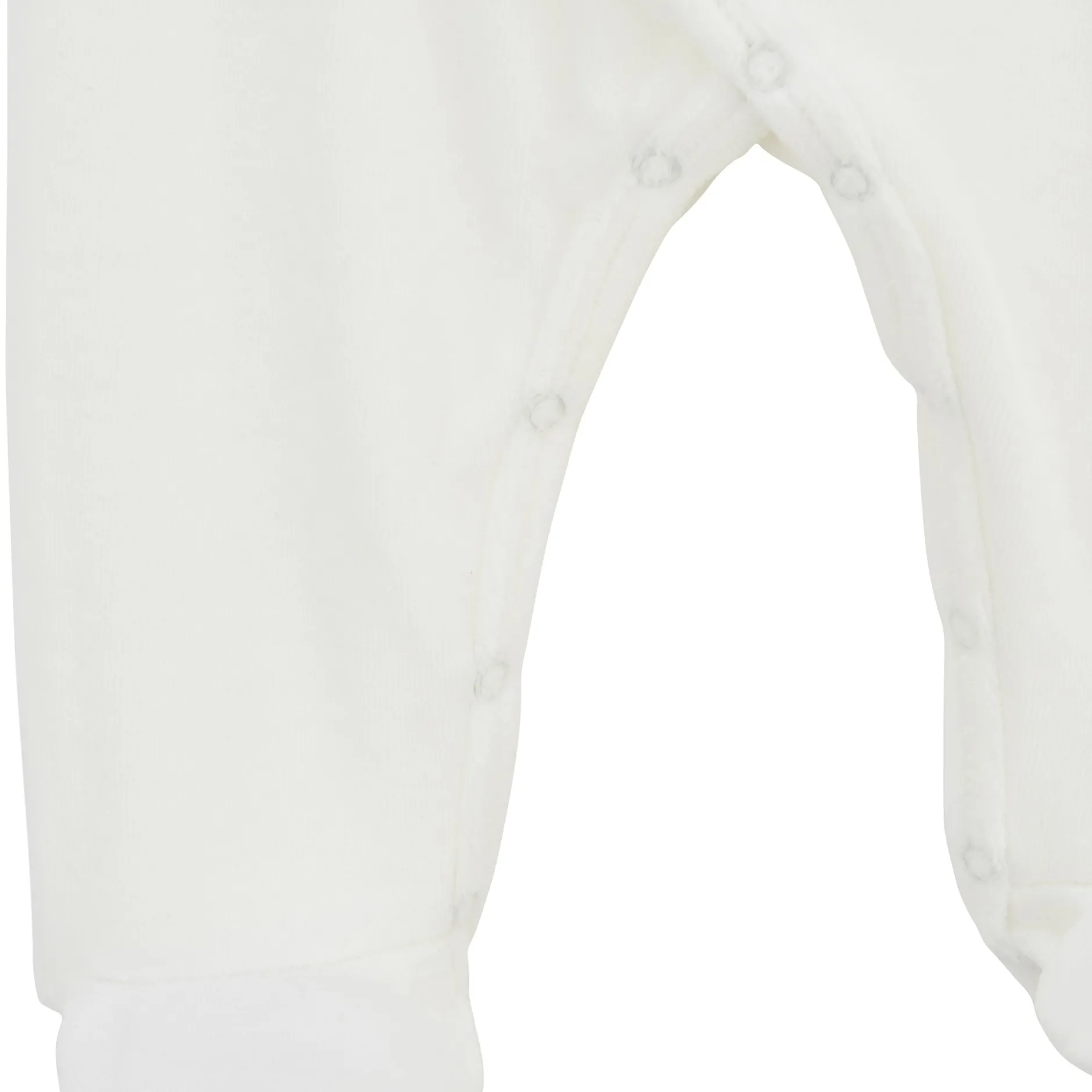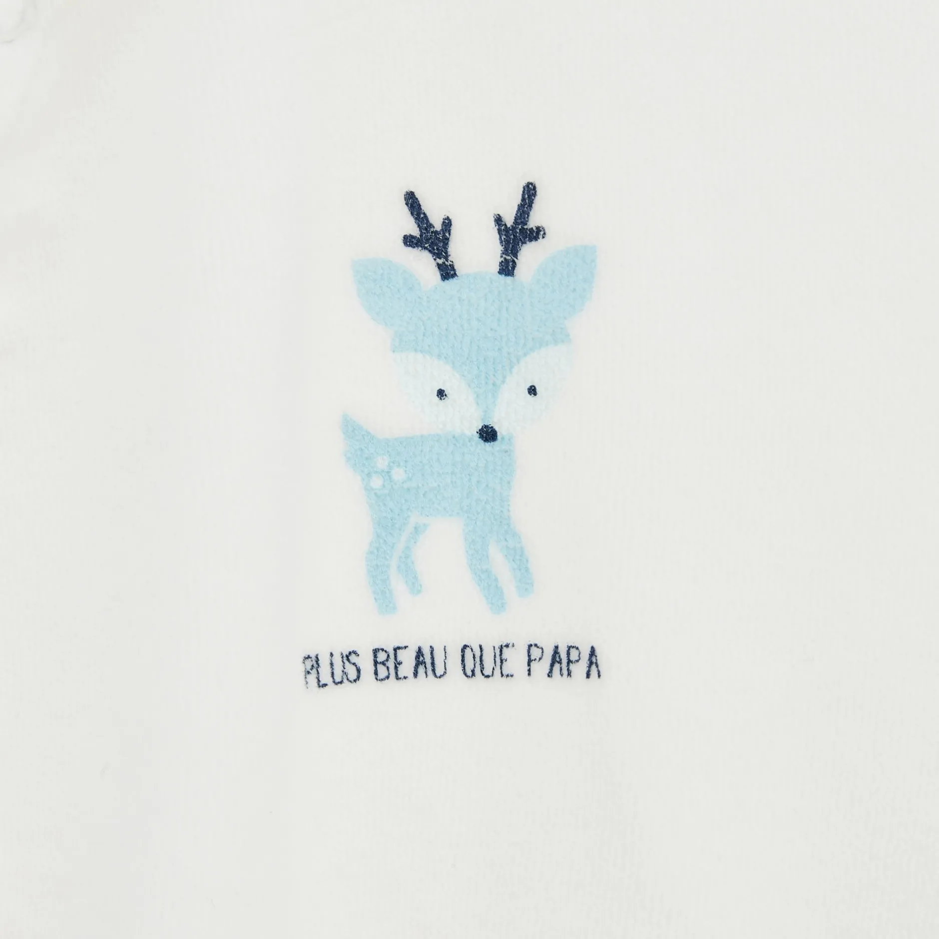 Pyjama P’tit Bisou en velours tout doux en écru avec son col qui lui confère un aspect chic. Ouverture devant par pressions pour plus de fonctionnalité et faciliter le change de bébé. Très jolie animation représentant un petit daim en sérigraphie sur le devant, tellement adorable ! Une pièce confort qui habillera bébé aussi bien le jour que la nuit.