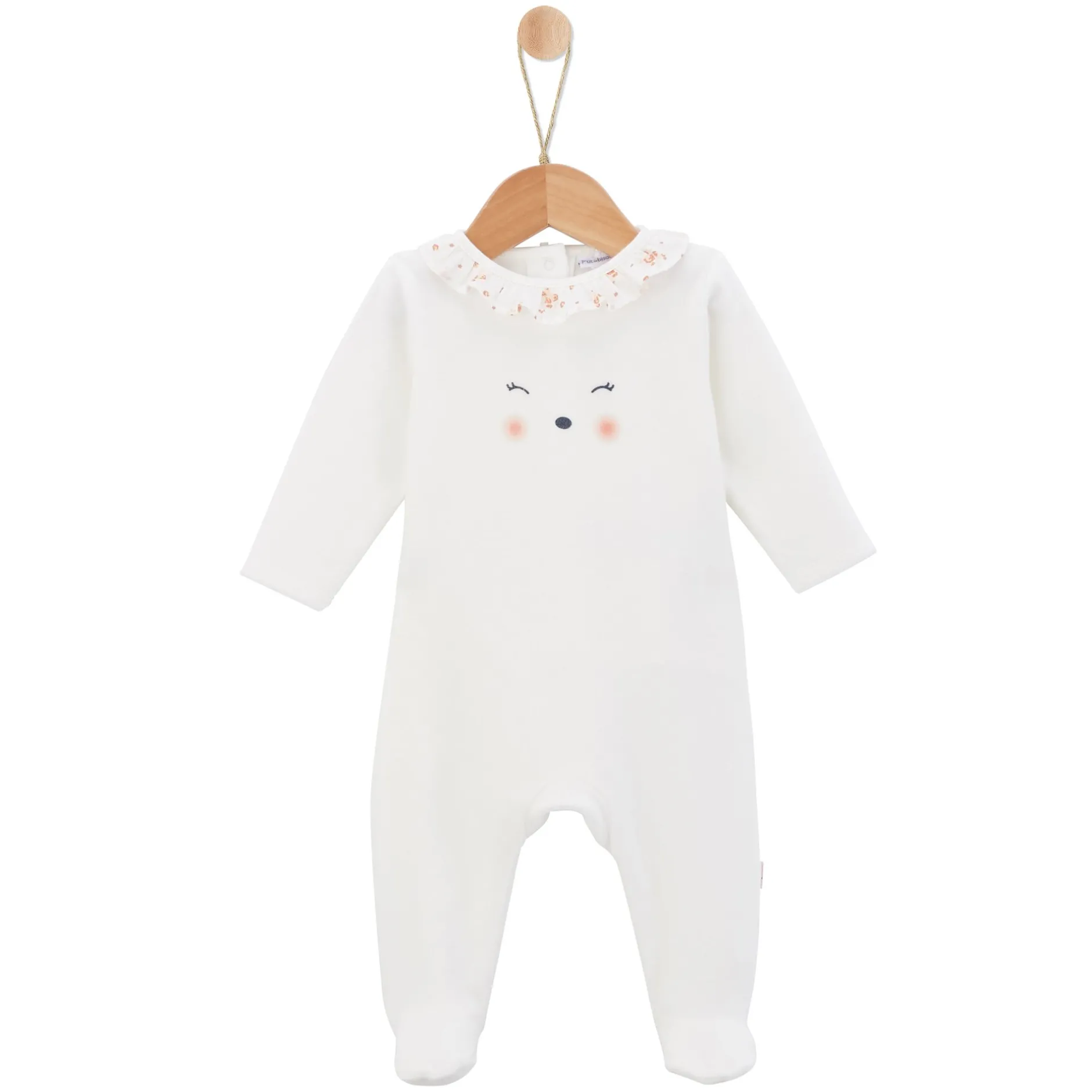 Pyjama P’tit Bisou en velours tout doux en écru avec son col à volants et froncé en voile imprimé floral pour un côté très rétro-chic .