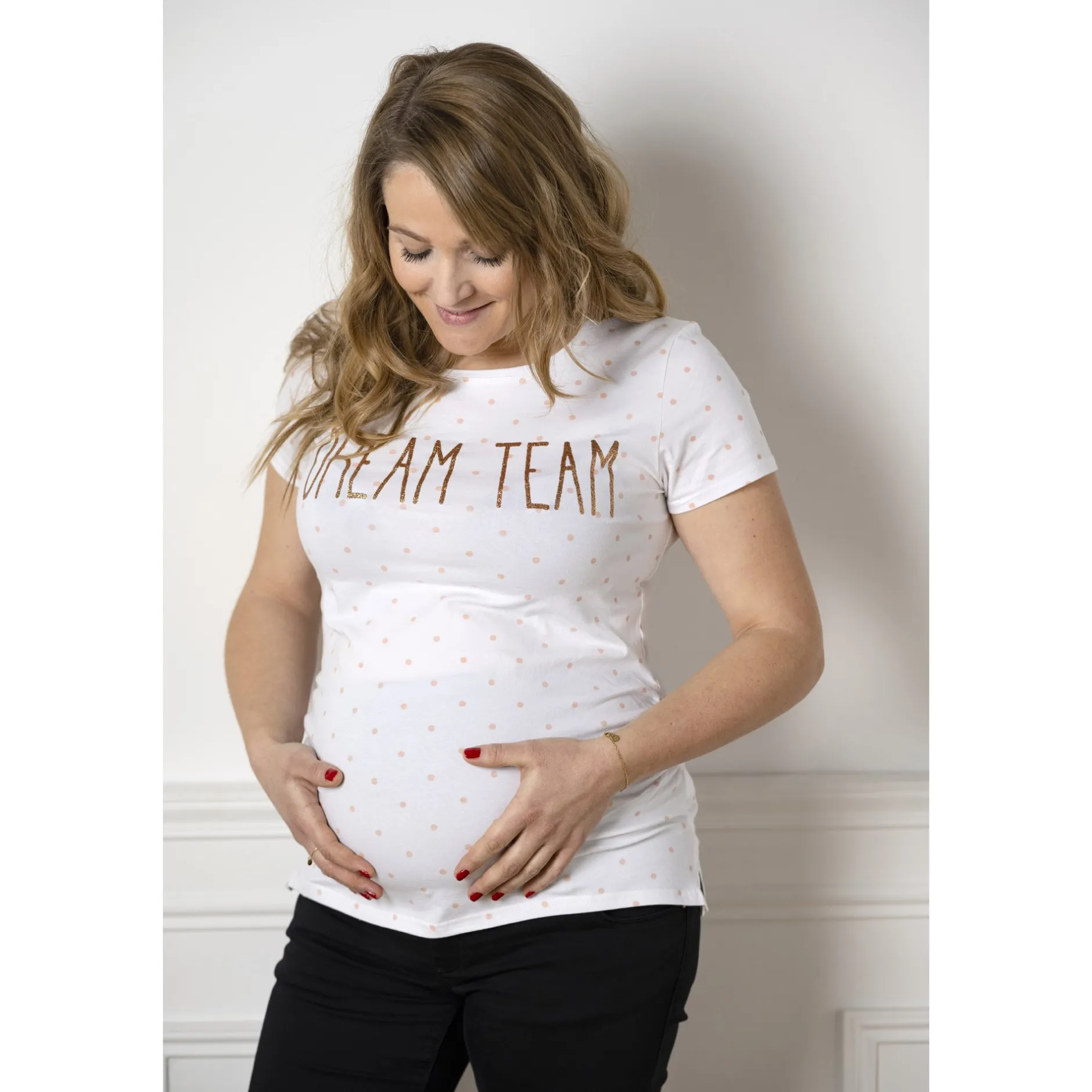 Spécialement conçus pour vous accompagner dès les premiers mois de votre grossesse jusqu’au moment de la naissance de bébé, ce t-shirt blanc à manches courtes adapté à votre ventre tout rond de femme enceinte. Ravissant motif à pois rose et inscription en paillette rose gold « Dream Team » .